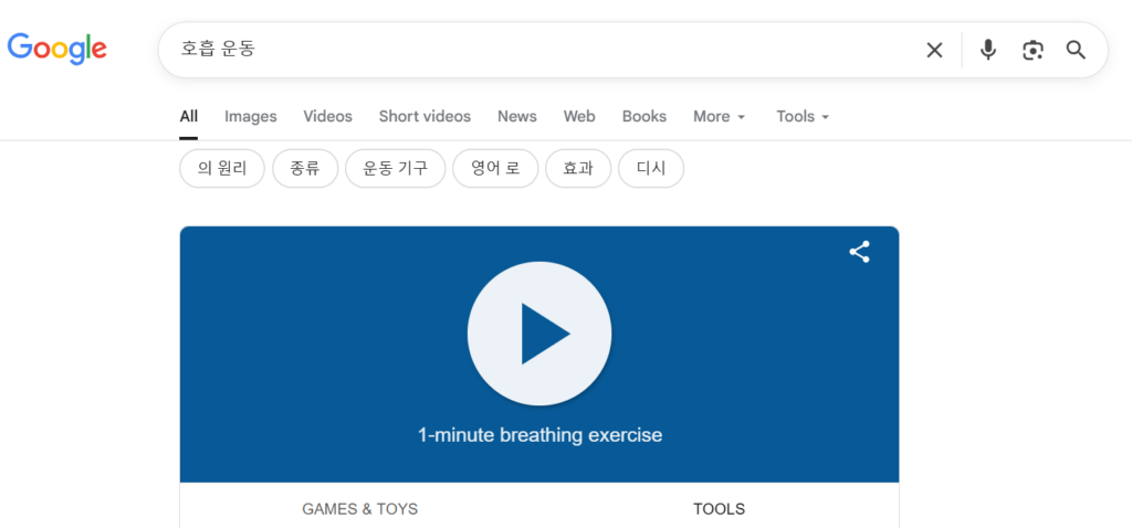 google 호흡 운동 은 구글 검색창에 ‘호흡 운동’ 또는 ‘breathing exercise’를 입력하면 바로 실행되는 간단한 기능입니다. 검색 결과 상단에 원형 애니메이션이 나타나고, 그 움직임에 맞춰 숨을 들이마시고 내쉬도록 안내합니다. 전체 과정은 약 1분 정도로 매우 짧습니다.