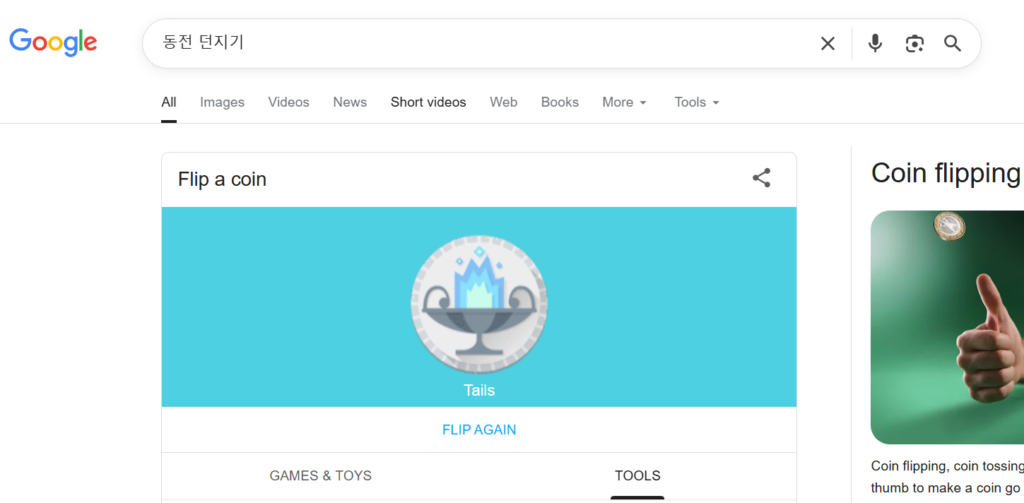 - Google 검색창에 “동전 던지기” 또는 라고 입력하여 검색